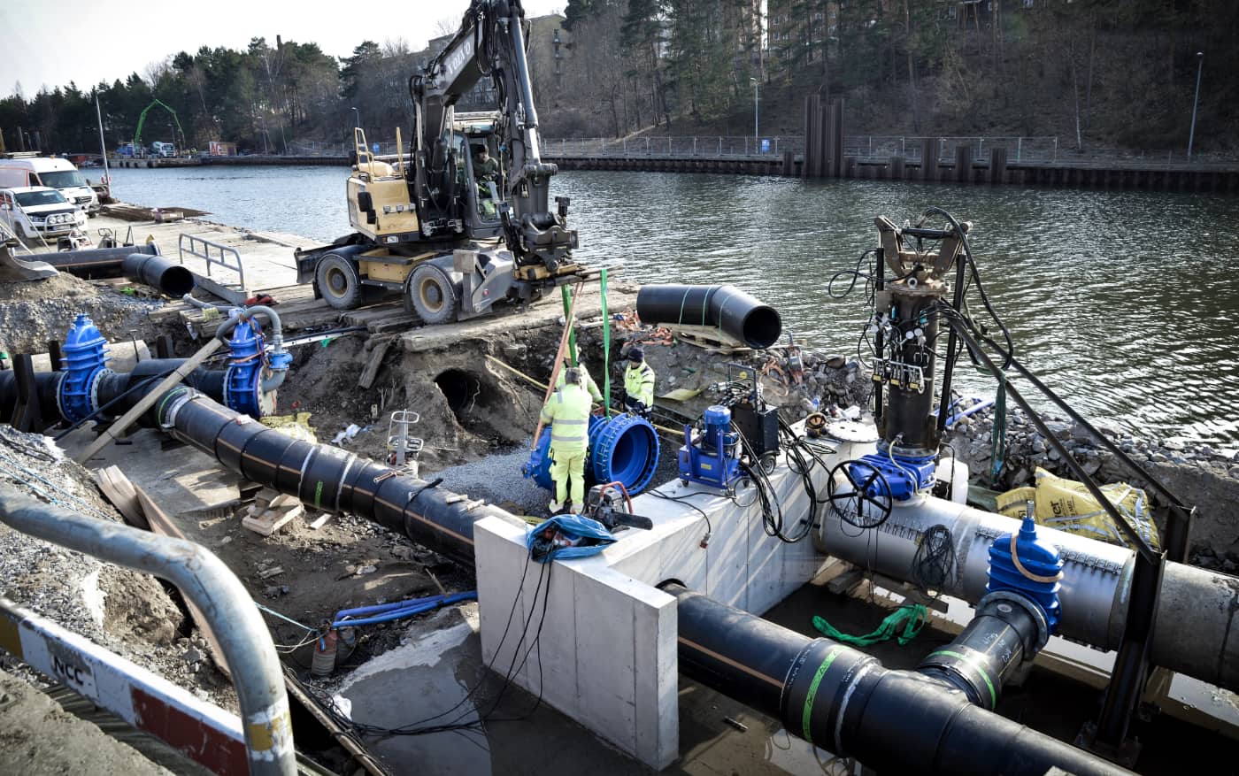 Utbyggnad av slussen i Södertälje kanalInför utbyggnaden av slussen i Södertälje kanal behöver en huvudavloppsledning förnyas och säkras upp. Med hjälp av vår teknik kunde ledningen flyttas under drift och utan påverkan på vattnet i kanalen.